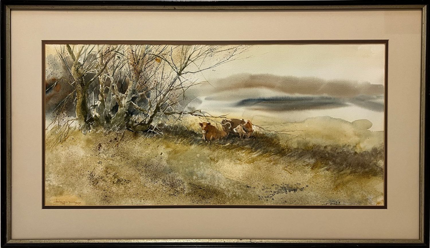 Rogers, Charles (1911-1987) untitled cows, watercolor, signed in lower left, good condition, image size: 14.75 x 31 inches.A painter, art educator, and member of the Prairie Printmaker Society, Charles B Rogers (1911-1987) was known for his airy landscapes of the American West, often with pastel hues executed in oil. He was born in Great Bend, Kansas, and studied at the National Academy of Design; Bethany College in Lindsborg, Kansas under Birger Sandzen; the California College of Arts and Crafts; and with Dong Kingman and Jay Connaway. From 1947 to 1953, he taught at Lindsborg College, and from 1954 to 1966, he was Manager and Assistant Director of the Huntington Hartford Museum in Los Angeles. After that, he was a Professor of Art at Kansas State University.