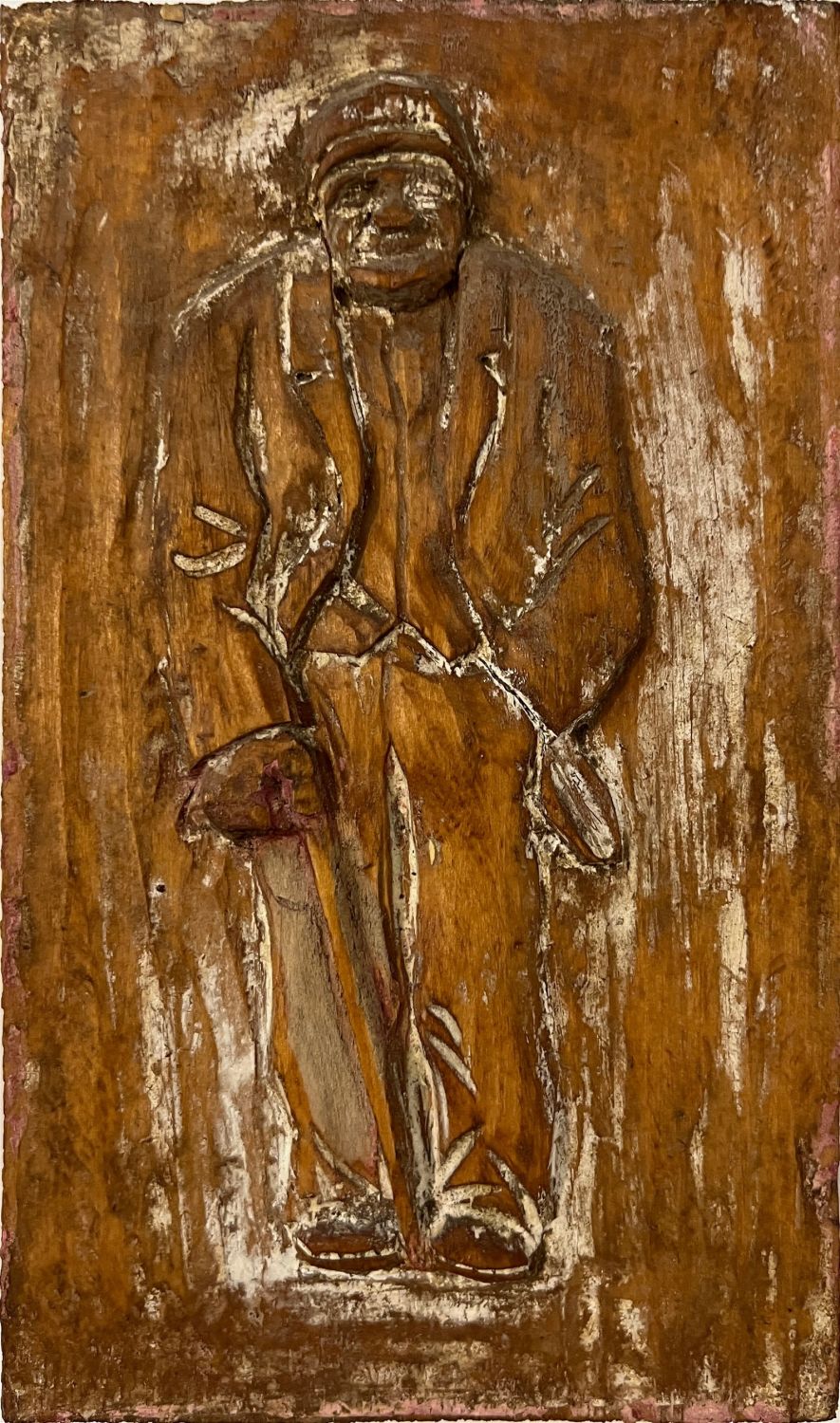 Pearson, Anton (1892-1967) untitled old man, woodcut relief, unsigned, good condition, size: 8.5 x 5 x 1 inches. Nils Anton Pearson was born 23 May 1892 in Lund, Sweden. He started carving at the age of nine. Many of the boys in his school were also learning to carve, all of them inspired by the Swedish woodcarver D?derhultarn. Anton attended a technical school at the University of Lund because his father wanted him to be an engineer. Anton was more interested in the arts.It is unclear at this time why Anton decided to travel to America. His family suspects his adventurous personality played a part in the decision. Whatever the reason, he tried to book passage on the RMS Titanic, but the ship was sold out.Anton arrived in America in May 1912, just a few days before his twentieth birthday. He settled in Chicago for a time.In 1915, after visiting the world’s fair in San Francisco, Anton decided to make a stop in a little town called Lindsborg, Kansas, a stop that would change the course of his life. Anton enrolled in Bethany College to study fine arts under his friend and mentor Birger Sandzen. By December 1918, he was exhibiting paintings at art shows locally and in surrounding areas.Anton in Lindsborg supported himself during these years by being a field agent for the Capper Publishing Company as well as selling Wearever aluminum kitchen utensils and as an "oil man" working for an oil company securing land owners contracts to drill on their property.During his Bethany College years, Anton met a quietly delightful piano student named Grace Lane. She was a direct descendant of the Pilgrim William Brewster. Their courtship was a long one, as Anton had many adventures he wanted to experience.In 1922, Anton took a four-month sojourn traveling by horse and wagon, homemade houseboat, car and rail over 3,600 miles to travel the US and get inspiration for his art. He returned with nearly 200 paintings. Anton sent Grace many letters during this trip.Anton’s friendship with Birger Sandzen was a rewarding one. Sandzen was not only Anton’s teacher and mentor, but a friend as well. Many Saturdays would find the two driving around in a Model T Ford from sunup to sundown seeking interesting scenes to sketch for paintings.After many adventures, Anton married Grace Lane in 1929. Anton and Grace honeymooned in Colorado. Their daughter Rosemary was born in 1933.Anton and Grace built their home in Lindsborg in 1929. Anton collected many interesting things during his travels: rocks, antiques, discarded building materials. Anton enjoyed finding treasures and repurposing them for his home and studio. Anton would later build a garage in the rear that eventually became his woodcarving studio.Anton served his adopted country in WWI. He was stationed at Camp Cody, NM. He worked for the aircraft industry in Wichita, KS during WWII. After the war, he continued to carve and amassed quite a collection of wonderful carvings. He opened his studio to tourists and visiting school groups. He went to schools and spoke about carving and the arts.In his studio, Anton indulged in his childhood passion: woodcarving. He continued to paint as well, but the majority of his time was spent carving.Anton’s pioneer figures were mostly carved from redwood, catalpa, mahogany, cottonwood and even limestone. He did many other creative carvings, from funny figures to large animals. Anton admired the pioneers of Lindsborg. He listened intently to their stories and they influenced his carvings. They show Swedish pioneers at work and at play, living their daily lives.Anton said he created the characters he carved by closing his eyes and envisioning them. It’s been suggested that perhaps Lindsborg residents crept into his mind, as many of his carvings certainly resembled Lindsborgians he encountered.