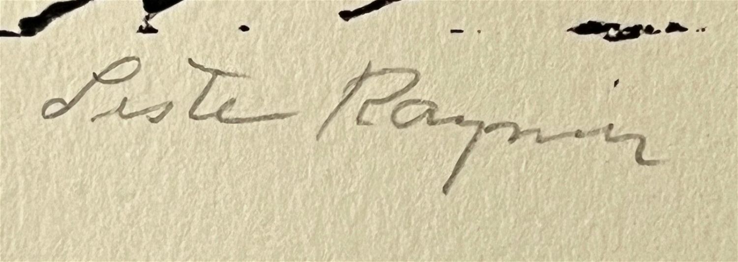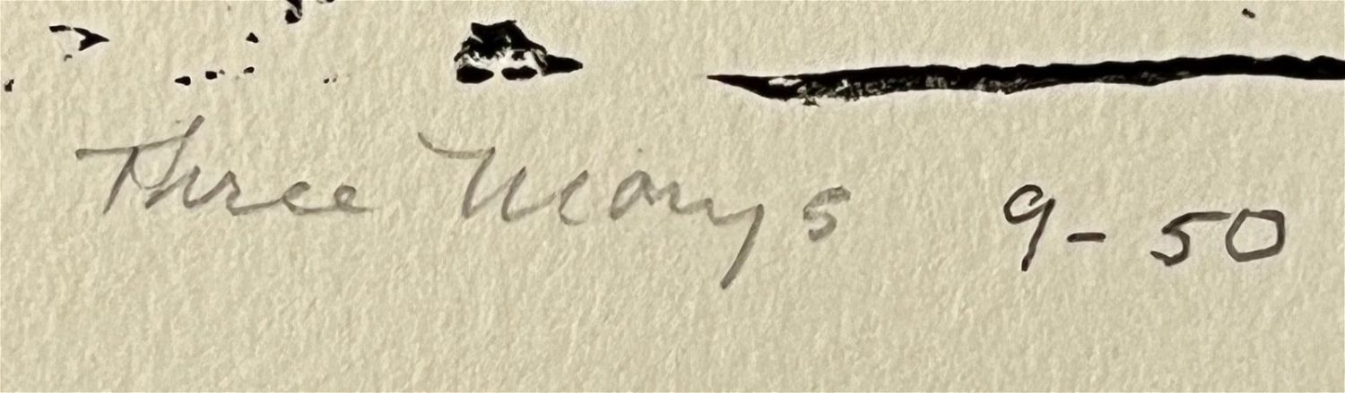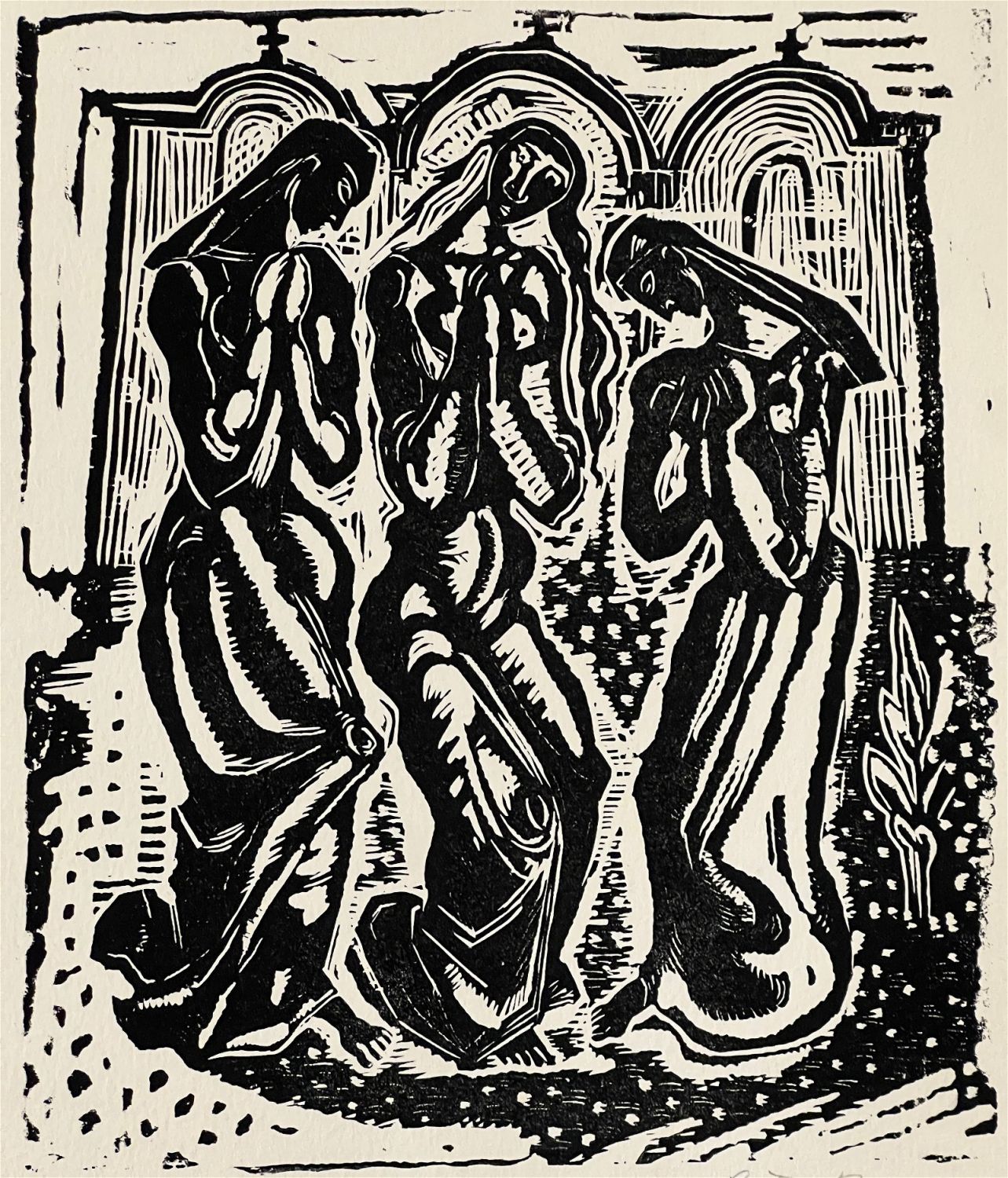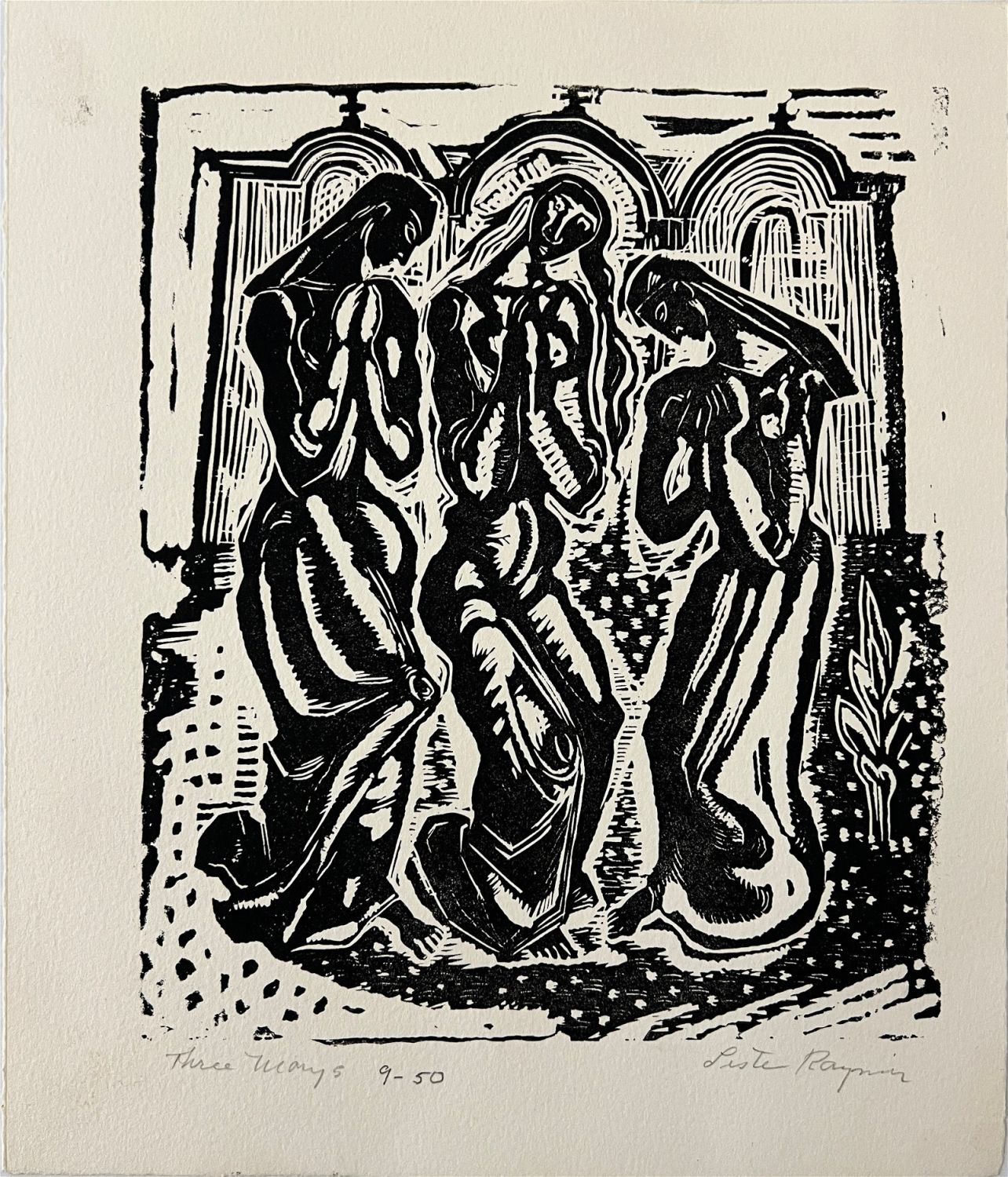 Raymer, Lester (1907-1991) "Three Marys" linoleum block print, pencil signed in lower right, good condition, unframed, image size: 8.25 x 6.75 inches. Lester Raymer, born in 1907, grew up on a farm just southwest of Alva, Oklahoma. Raymer worked with a variety of art forms beginning in his early grade school years and continuing throughout his artistic career. He received his bachelor’s degree in art from the Art Institute of Chicago. From 1936 to 1945 Raymer lived on his family farm again and continued to develop his artwork. Raymer met Ramona Weddle, his future wife, at the Art Institute.Raymer’s art was influenced by a number of factors. The circus came to Alva often during Raymer’s childhood. He worked for a poultry business where he did drawings and paintings in his spare time. The "Bible" was a source of imagery beginning in his childhood. Raymer’s painting professor at the Chicago Art Institute was Boris Anisfeld from Russia, and his art history professor was Helen Gardner, author of "Art Through the Ages", long-time used as a textbook of American art. Raymer talked often of the great influence his trips to Mexico had on his artwork and of his desire to remodel his studio in the style of a Mexican home.Raymer won major awards and international recognition with his religious art work and liturgical commissions. He taught one year at Bethany College in the art department and then made his living from the sale of his artwork. He utilized a variety of materials to produce a diverse body of artwork. Lamps, candleholders, furniture, and many of the sculptures in the studio were made for the studio use, not to sell. His paintings were most significant to him.Raymer was a studio artist in Lindsborg, Kansas until his death in 1991