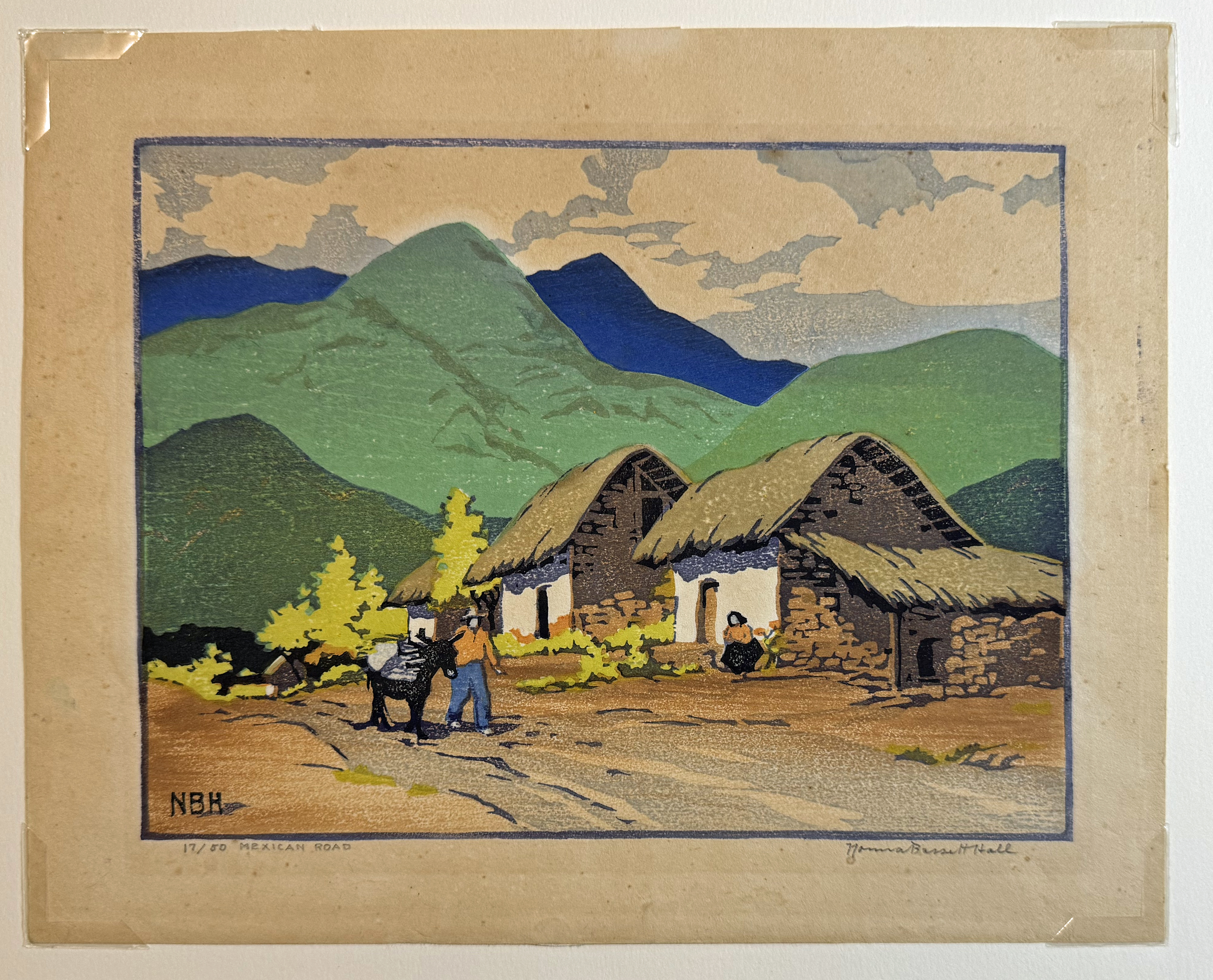 Hall, Norma Bassett (1889-1957)j Mexican Road, color wood block, pencil signed in lower right, good condition, image size: 6.75 x 9 inches. Only woman charter member of Prairie Print Makers. Most remembered as a woodblock printmaker and one of the founding members of the Prairie Printmakers, Norma Bassett Hall was the only woman charter member of that group and the only one to establish a reputation exclusively with color prints. She was born and raised in Halsey, Oregon, and took her first art lessons at the School of the Portland Art Association, where she studied for three years. After graduation, she gave private art lessons.In 1915, she enrolled at the Art Institute of Chicago, graduating in 1918. There she was an assistant teacher for one year and met her future husband, Arthur William Hall, who was also a student there and whose studies were interrupted by army service in World War I. Norma Hall worked on defense projects in a drafting office after her graduation until the end of the war.In 1920, she returned to Oregon where she opened a studio in Portland and taught in a high school. Two years later she and Arthur were married.Her interest in woodblock printmaking dated from 1922 when she was on a Cannon Beach, Oregon honeymoon trip with Arthur. The couple decided to make a pictorial visit of their trip by copying block prints from a book, and she saw what she described as the "real possibilities" of block printmaking. She used the Oriental method, which is the mixing of dry color with water and rice-flour paste.She had a residency in Kansas in 1923, and furthered her interest and skills in color block prints. She and her husband spent two years in Europe, 1925 to 1927, studying and sketching including time in London and Edinburgh, Scotland where she met Mable Royds, married to etcher E.S. Lumsden. From Royds, she learned the Japanese woodcut print method on rice paper involving transparent watercolors, which for Hall was a redirection from opaque oil based colors. Adopting this approach exclusively for many years, Hall printed with as many as six or seven colors, each requiring a separate hand cut woodblock. In 1942, the couple moved to Santa Fe, New Mexico where her reputation was established for her block prints of the Southwest, especially New Mexico. After a short time, the couple settled in Alcalde, New Mexico where the couple continued painting and also opened a summer art school. She began to devote a lot of time to serigraphs of local scenes and also did watercolors. The subjects of the totality of her work reflect the wide travels of the Halls and include Kansas-farm scenes, Oregon landscapes, European scenes and New Mexico pueblos.